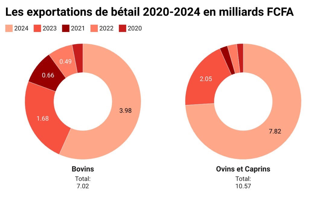 Au total, les exportations combinées de bovins, ovins et caprins sont passées de 0,40 milliard FCFA en 2020 à près de 11,8 milliards FCFA en 2024, soit une multiplication par près de 30 en quatre ans.