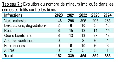 Parmi les 1 641 mineurs impliqués dans des crimes et délits contre les biens, près de neuf sur dix le sont pour des vols ou extorsions. Les autres infractions (recels, escroqueries, abus de confiance, destructions et dégradations, ou grand banditisme) restent minoritaires. L’année 2022 enregistre un pic avec 396 mineurs concernés par des vols et extorsions, avant un léger recul à 285 en 2024.