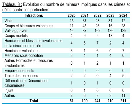 Les crimes et délits contre les personnes concernent 922 mineurs sur la période. Les vols aggravés représentent 58,6 % des cas, suivis des coups et blessures volontaires (13,7 %) et des viols (13,3 %). En 2024, 139 mineurs sont impliqués dans des vols aggravés, 28 dans des coups et blessures volontaires et 12 dans des viols. Les autres infractions (homicides volontaires, coups mortels ou traite des personnes) restent marginales.