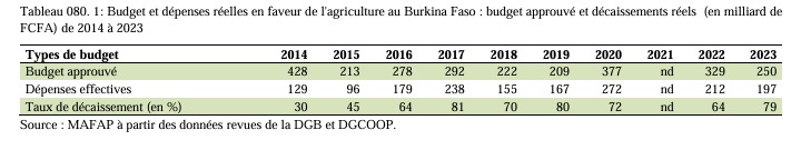 Les dépenses publiques consacrées à l’agriculture au Burkina Faso ont connu de fortes variations entre 2014 et 2023, selon les données compilées par le ministère en charge de l’agriculture. Les enveloppes budgétaires approuvées sont demeurées importantes, mais c’est seulement en 2017 et 2019 que les taux de décaissement ont atteint 80%.