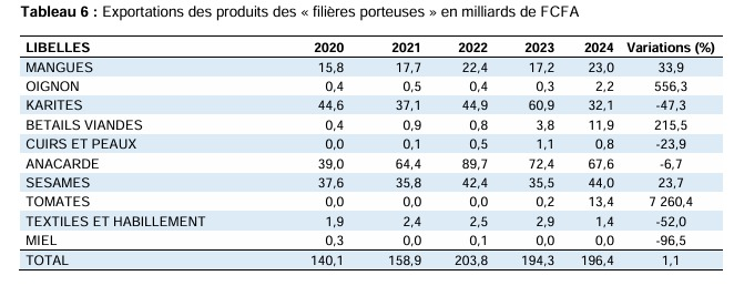 Les filières porteuses continuent de soutenir les exportations nationales. En 2024, elles affichent une légère progression globale, portée notamment par le dynamisme du sésame et de la mangue, tandis que l’anacarde et le karité marquent le pas.