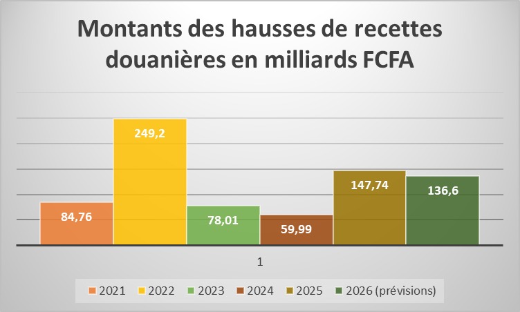 Pour 2025, les recettes sont estimées à 1 231 milliards FCFA, selon la Direction générale des douanes. Cela représente une progression de 147,74 milliards FCFA, équivalente à une hausse de 13,64 %.