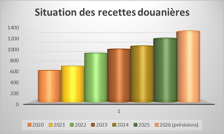 Les recettes douanières affichent une dynamique de croissance sur la période 2020-2025. Après l’année 2025, au cours de laquelle la Direction générale estime ses recettes à 1 231 milliards FCFA, l’objectif est désormais d’atteindre 1 367,6 milliards FCFA, soit une progression projetée de 11,1 %.