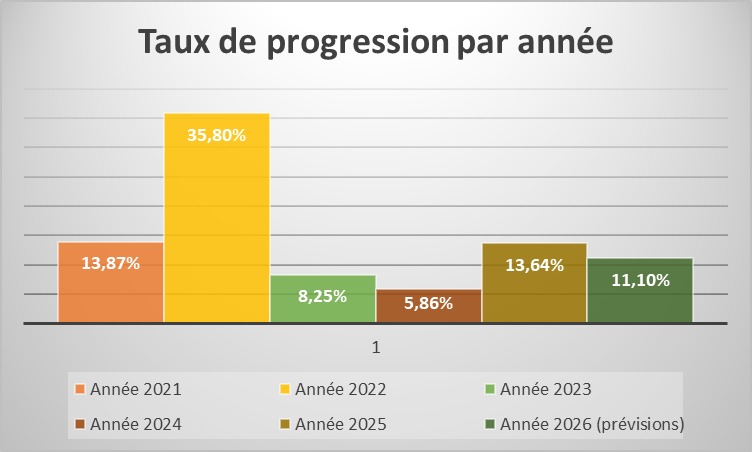 Entre 2020 et les prévisions de 2026, les recettes passeraient de 611,30 milliards FCFA à 1 367,6 milliards FCFA, soit une augmentation globale de 756,3 milliards FCFA. En six ans, cela représenterait une progression cumulée de 123,7 %.