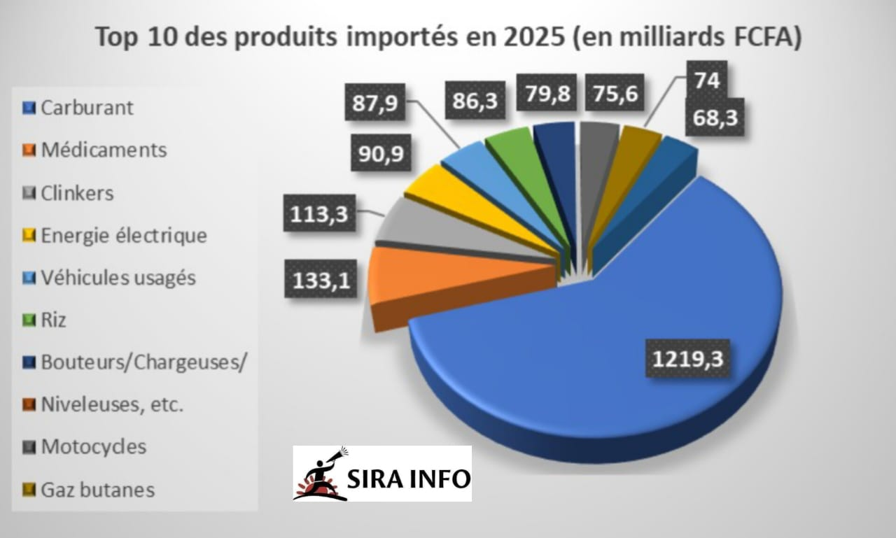 Au total, les dix principaux produits importés ont représenté 2 028,5 milliards FCFA en 2025, un volume largement dominé par le carburant.