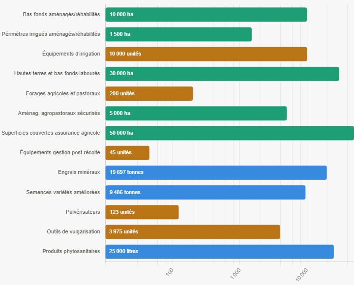 Sur le front agricole, les objectifs sont précis. Le programme prévoit l’aménagement ou la réhabilitation de 10 000 hectares de bas-fonds et de 1 500 hectares de périmètres irrigués, accompagnés de 10 000 équipements d’irrigation mis à la disposition des producteurs. À ces prévisions s’ajoutent 30 000 hectares de hautes terres et de bas-fonds à labourer, et 5 000 hectares d’aménagements agropastoraux à sécuriser.