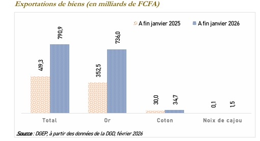 Les chiffres sont issus du rapport de la Direction générale de l’Économie et de la Planification (DGEP). À fin janvier 2026, les exportations du Burkina Faso s’élèvent à 790,9 milliards de FCFA, contre 419,3 milliards à la même période l’année précédente (janvier 2025), soit une progression fulgurante de 88,6 %.