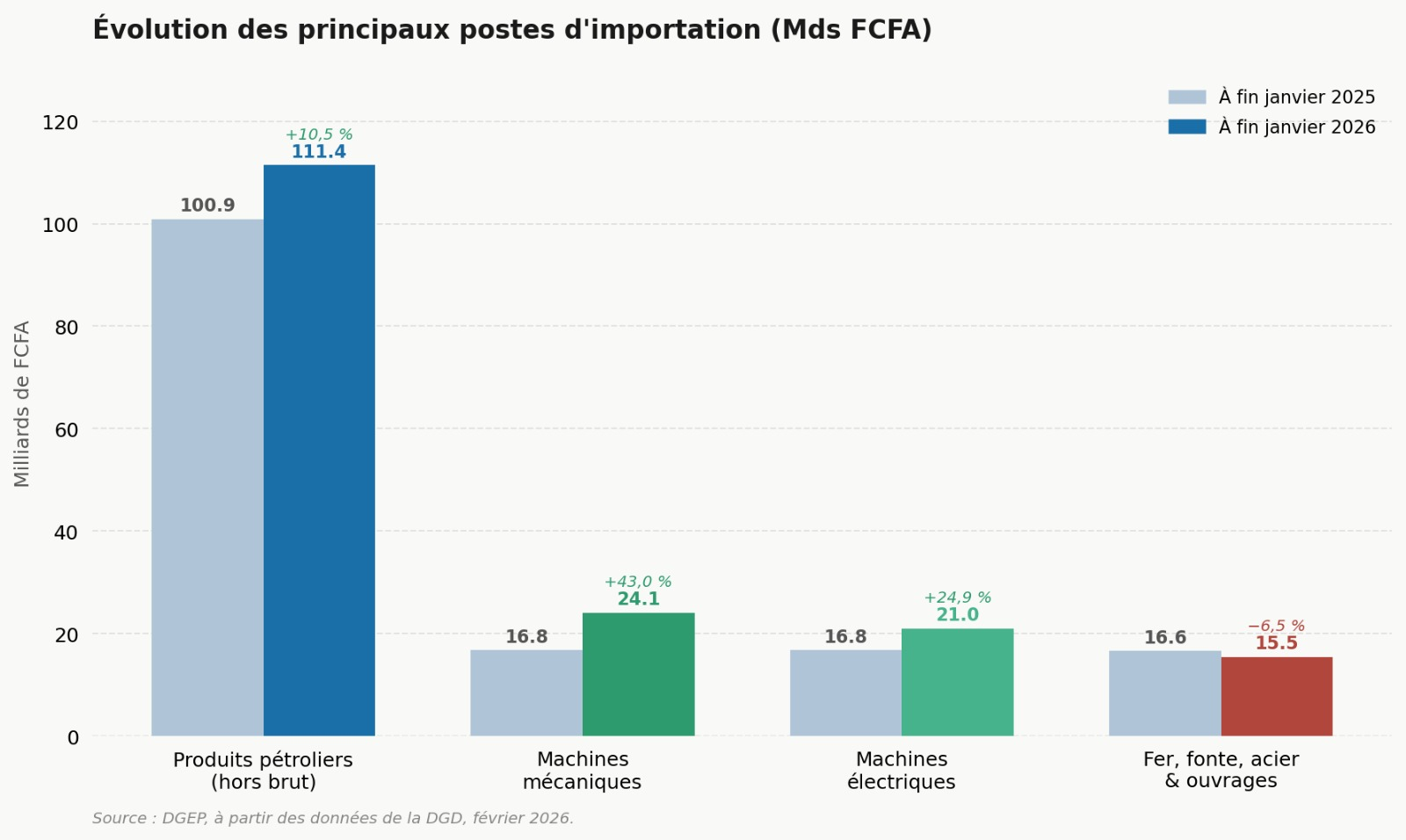 Cette évolution est principalement tirée par les achats de produits pétroliers hors pétrole brut, qui bondissent de 10,5 milliards de francs CFA pour s’établir à 111,4 milliards, contre 100,9 milliards à fin janvier 2025. Ce poste reste de loin le plus important dans la structure des importations du pays.