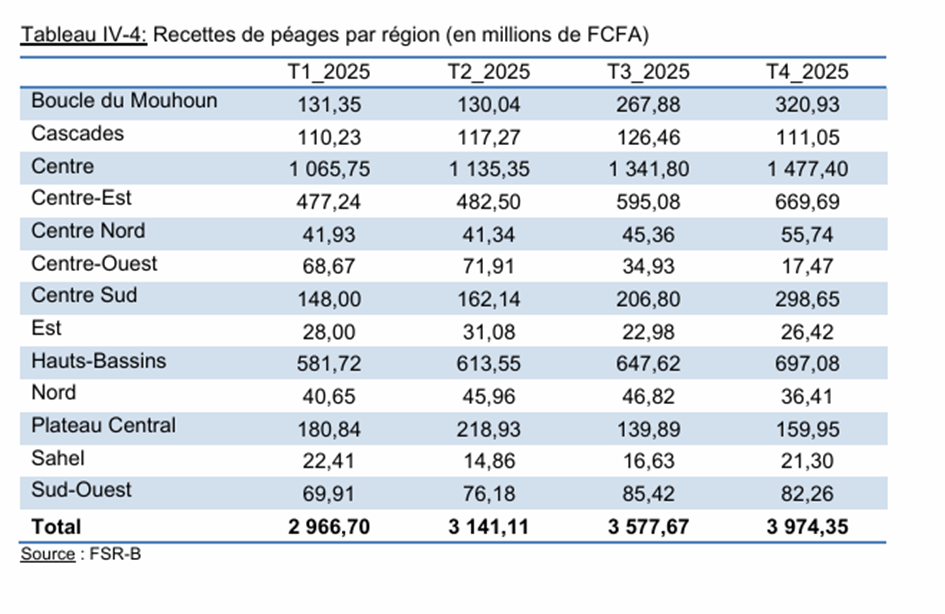 C’est au troisième trimestre que l’accélération a été la plus marquée : +13,9 % sur le trimestre, +34,7 % en glissement annuel, pour un total de 3,57 milliards de FCFA. Le quatrième trimestre a confirmé cette tendance avec 3,97 milliards, une hausse de 11,1 % sur le précédent et de 39,4 % par rapport au même trimestre de 2024. Le FSR-B attribue en grande partie cette performance « en grande partie à l’application de la nouvelle tarification de la taxe de péage pour les véhicules à essieux et la mise en fonctionnement des postes modernes de péage à partir du 24 juillet 2025. »