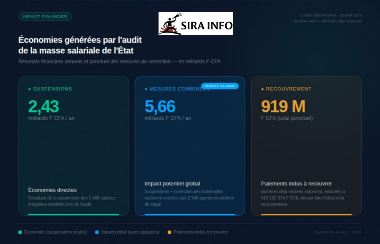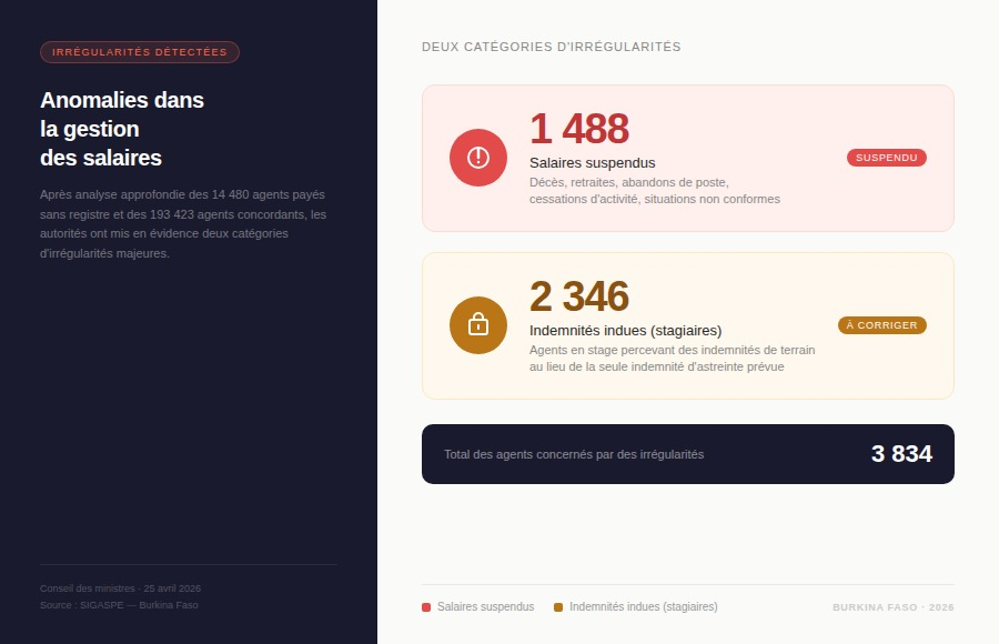 Le Conseil des ministres a rendu public les résultats d’un vaste chantier d’assainissement de la masse salariale de la fonction publique burkinabè. Un exercice de rapprochement entre le fichier de paie et les registres de personnel des ministères a mis au jour des irrégularités significatives, conduisant à des suspensions de salaires et à des économies chiffrées en milliards de francs CFA.