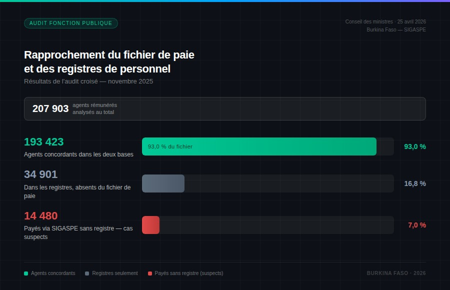 En novembre 2025, l’État burkinabè rémunérait 207 903 agents via le Système intégré de gestion administrative et salariale du personnel de l’État (SIGASPE). C’est sur cette base que les services compétents ont engagé un travail de croisement avec les registres administratifs des ministères et institutions.
